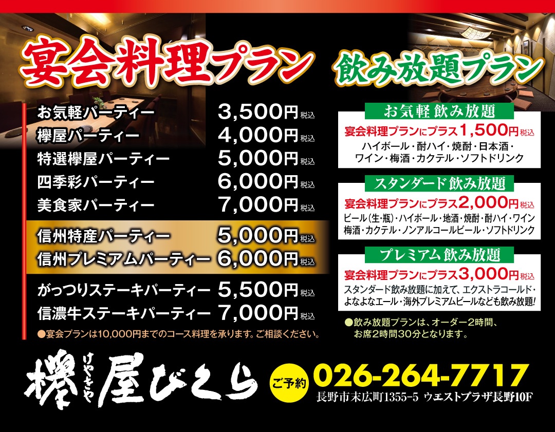 宴会料理の内容は!プランの下に記載↓↓しています! 個人盛り会席風コース料理は5,000円~となりますご了承のほどよろしくお願いいたします。 「4月1日よりお気軽飲み放題1,500円の内容が変更になります」ご了承のほどよろしくお願いいたします。 他にも、ご予算に合わせて1万円までご用意させていただきます 入荷状況によりメニューが変わります、ご了承ください。 詳細は店舗まで ℡ 026-264-7717